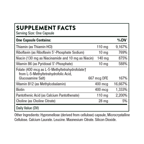 Delivers eight easily absorbed B vitamins, including their active forms, plus choline, to promote neurological function and cellular energy production.* This comprehensive blend supports the conversion of food into fuel, enhances cellular energy, and promotes healthy red blood cell formation, making it beneficial for maintaining an energetic body and mind.
